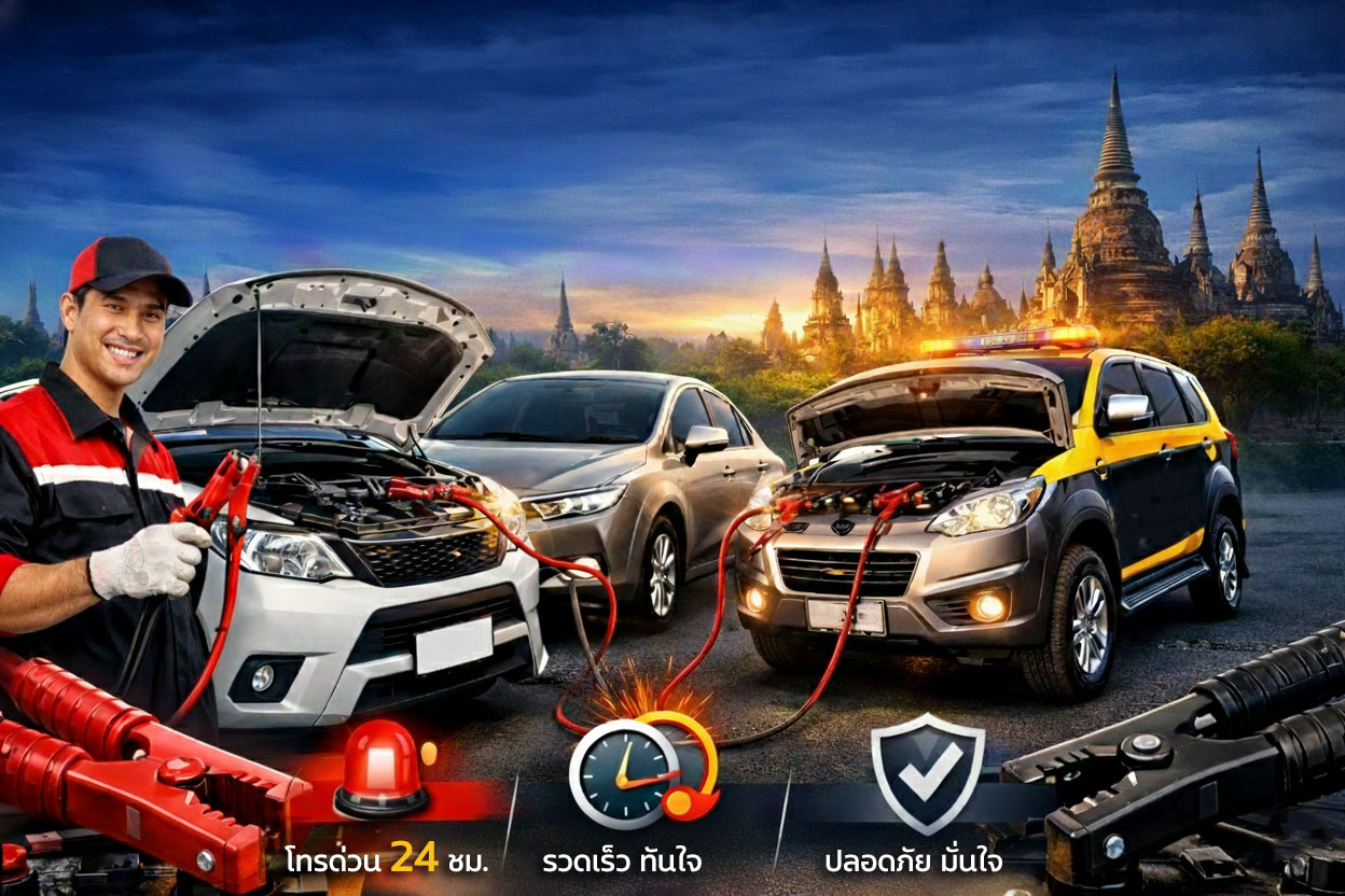 บริการพ่วงแบตเตอรี่รถยนต์ทุกประเภท ด้วยอุปกรณ์มาตรฐาน ปลอดภัย 100% ไม่ทำลายระบบไฟฟ้าของรถ โดยช่างมืออาชีพ อยุธยา 24 ชั่วโมง